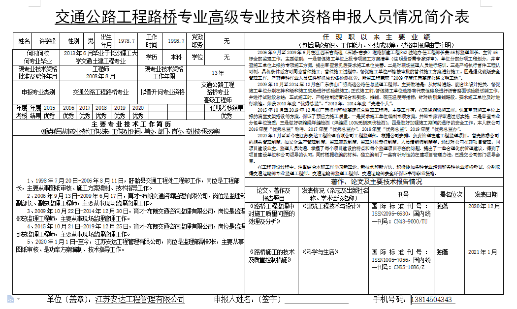 交通公路工程路桥专业高级专业技术资格申报人员情况简介表