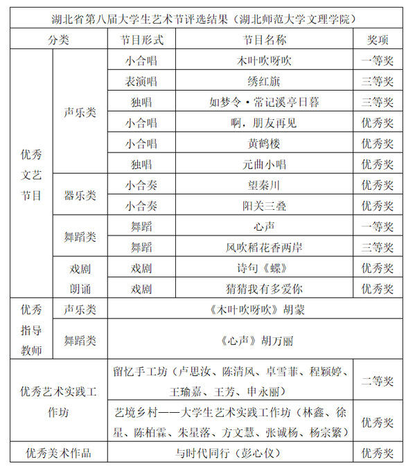 本网讯 5月6日,湖北省教育厅公布关于湖北省第八届大学生艺术节优秀组织奖和“三优一案例”评选结果的通知。乐竞(中国)教育与艺术学部荣获17个奖项,其中一等奖2项,二等奖1项,三等奖3项,优秀奖9项。胡蒙、胡万丽获指导教师奖。